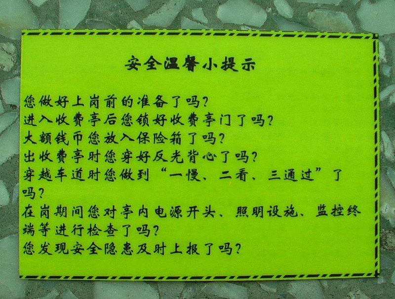 該站首先召開了專題會,精心組織,周密安排,營造濃厚的“安全生產月”活動氛圍;其次是形式多樣,務求實效。利用安全知識、安全提示卡、安全知識小測試等形式,普及安全生產常識。三是做好安全生產隱患自查自改工作。站安全領導小組集中對站內的收費、監(jiān)控、機電設施等重點區(qū)域進行了安全排查,針對發(fā)現(xiàn)的問題進行了整改。四是深化班組長在崗期間安全生產負責制。實施班組安全檢查制,每天由班組負責上崗期間收費亭、收費廣場的安全檢查,填寫《班組安全檢查記錄表》,做到了安全工作與業(yè)務工作的有效結合。( 110國道沙城收費站 王輝)