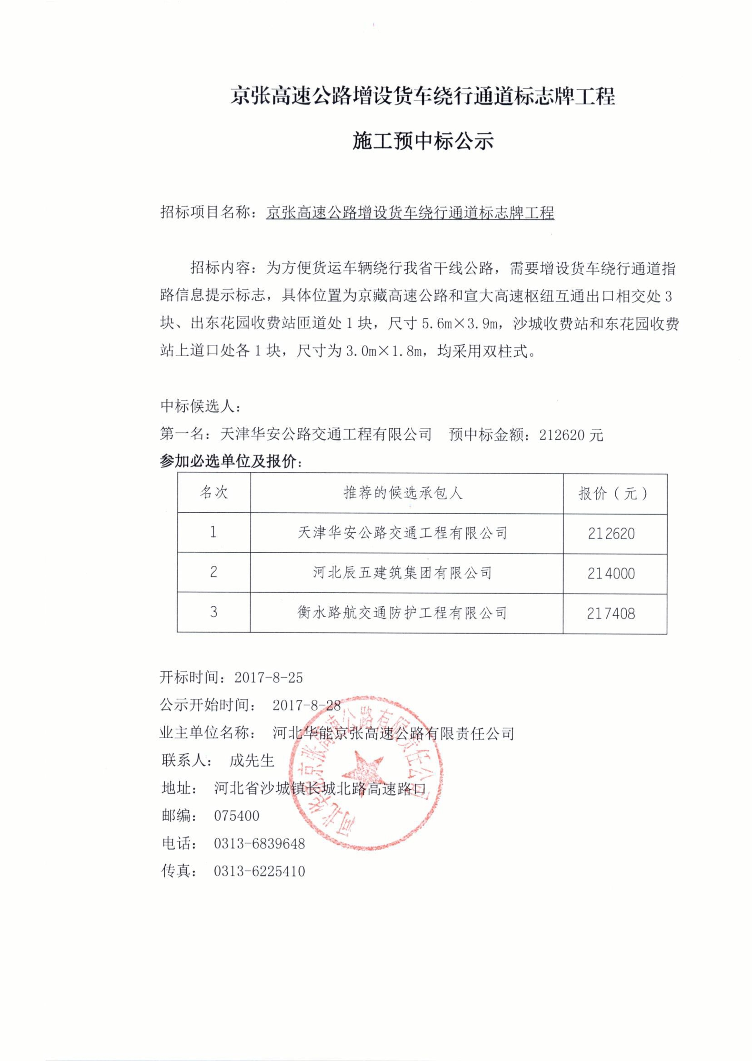 京張高速公路增設(shè)貨車?yán)@行通道標(biāo)志牌工程施工預(yù)中標(biāo)公示