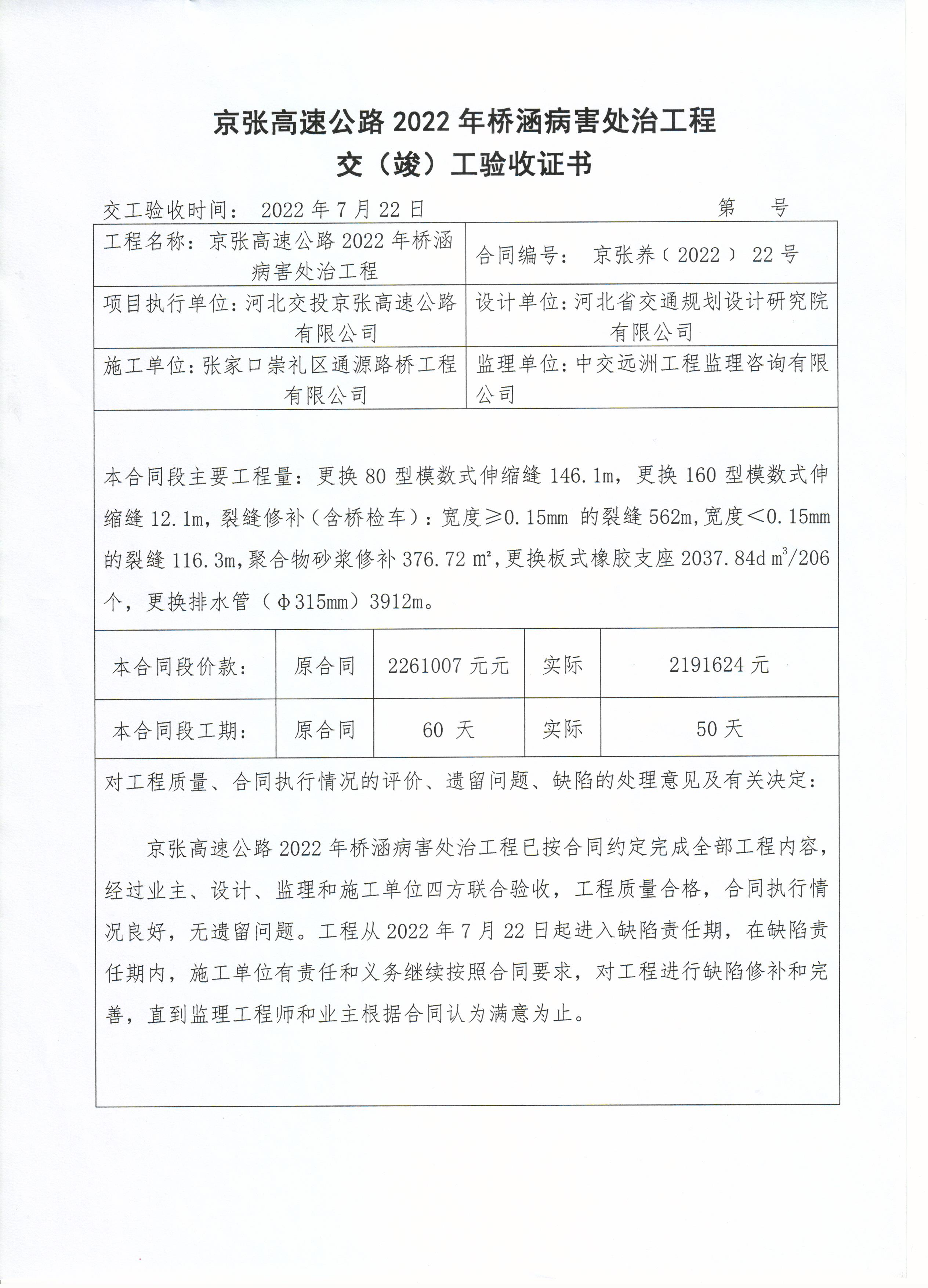 京張高速2022年橋涵病害處治工程竣工驗(yàn)收